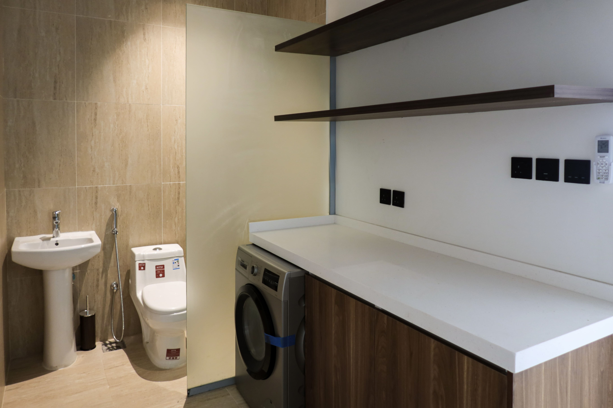 free WiFi and enjoy and TV for entertainment. The fully equipped American-style kitchen features a refrigerator, microwave, washing machine, and complete cookware, making home dining easy.