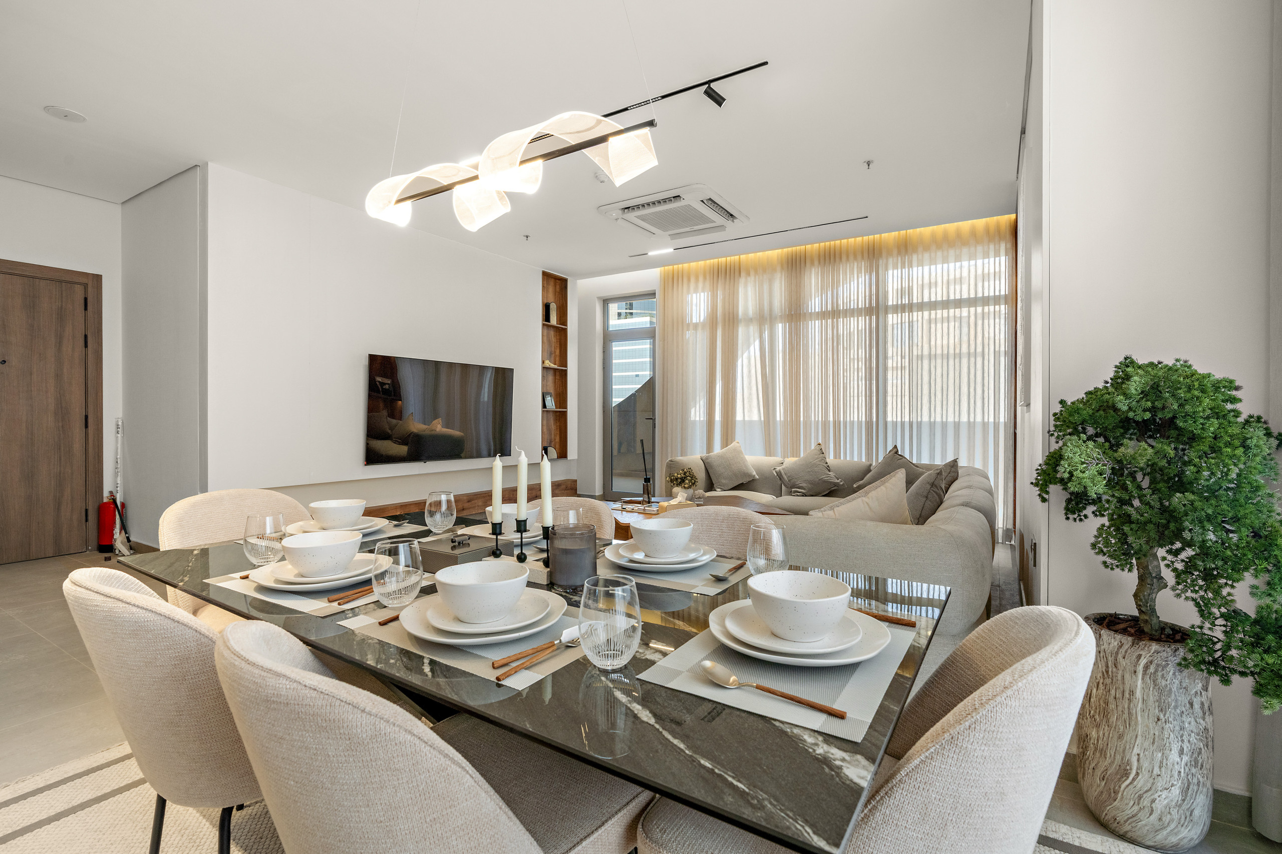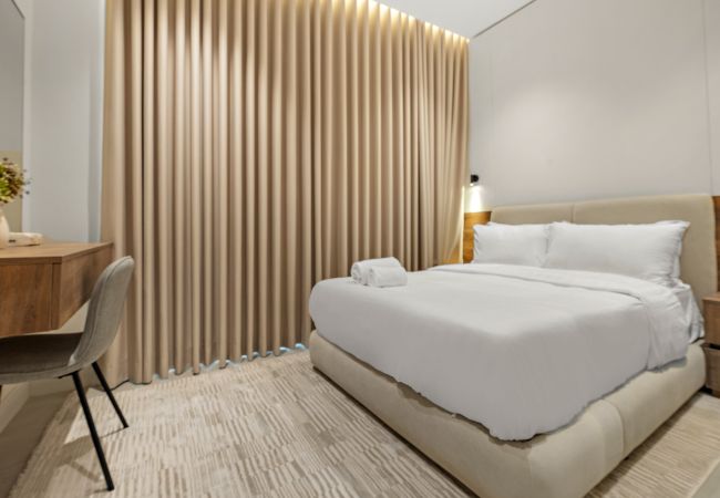 تضم الشقة مطبخًا عصريًا، ومنطقة معيشة مريحة، وغرفتين فسيحتين تحتوي إحداهما على سرير بحجم كينغ والأخرى على سرير بحجم كوين، بالإضافة إلى حمامين أنيقين.