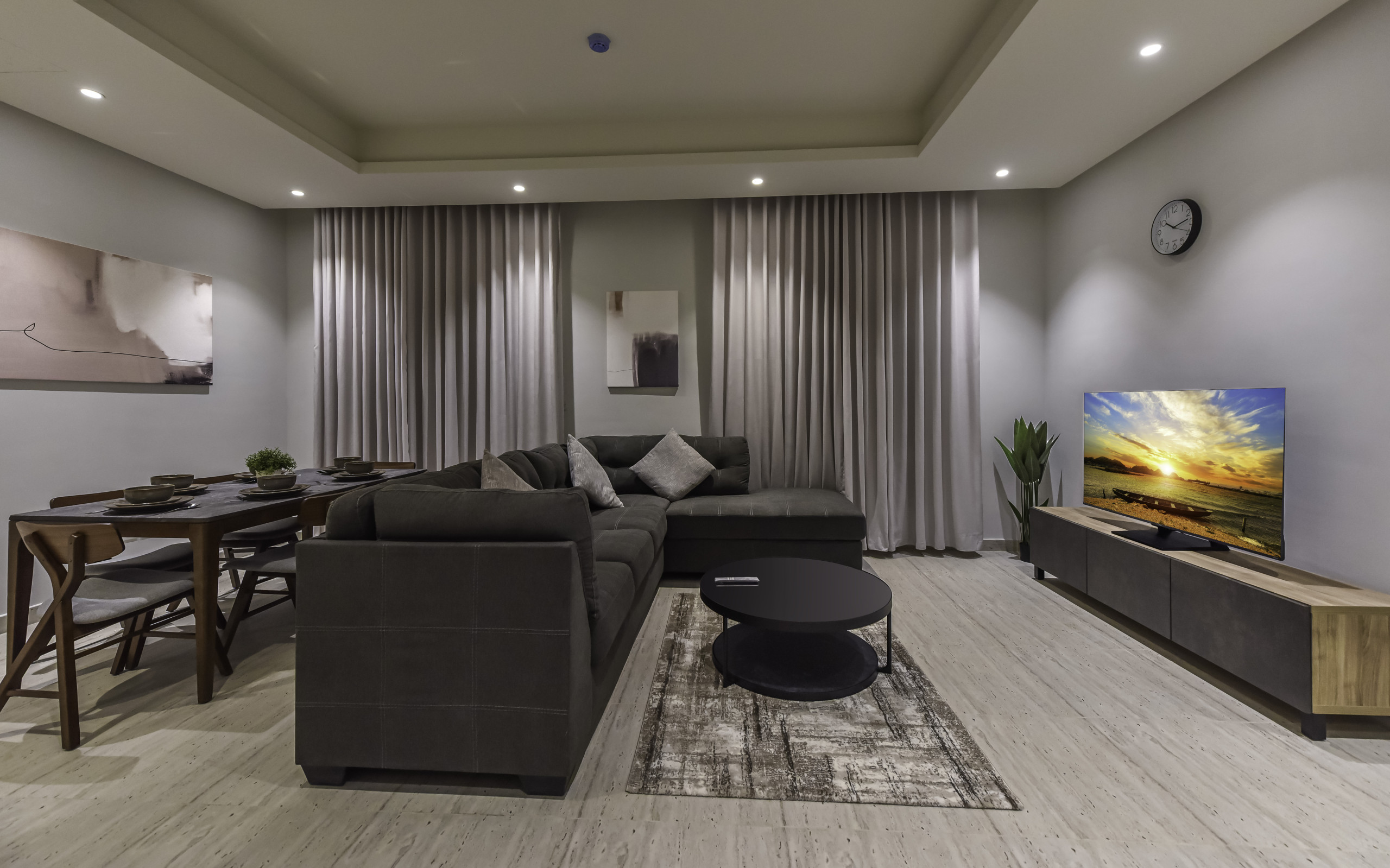 Spacious living area with air conditioning, smart Tv, and high-speed WiFi