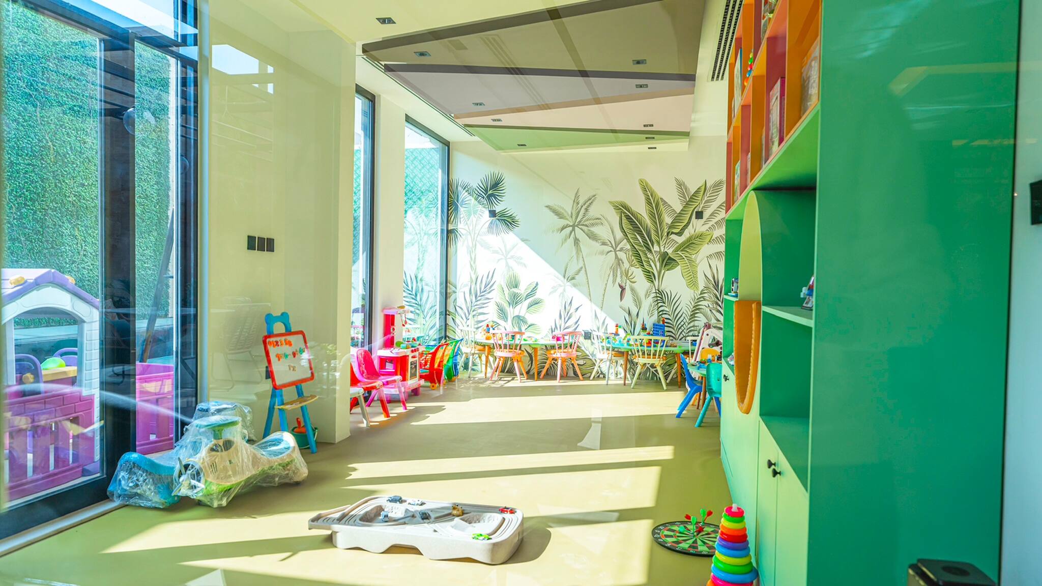 Luxurious apartment in Almalga, Riyadh, with 3 bedrooms, living area, kitchen, and 3 bathrooms. Amenities: play area, kindergarten, gym, pool, café, and mini-market. Rent includes internet & maintenance.