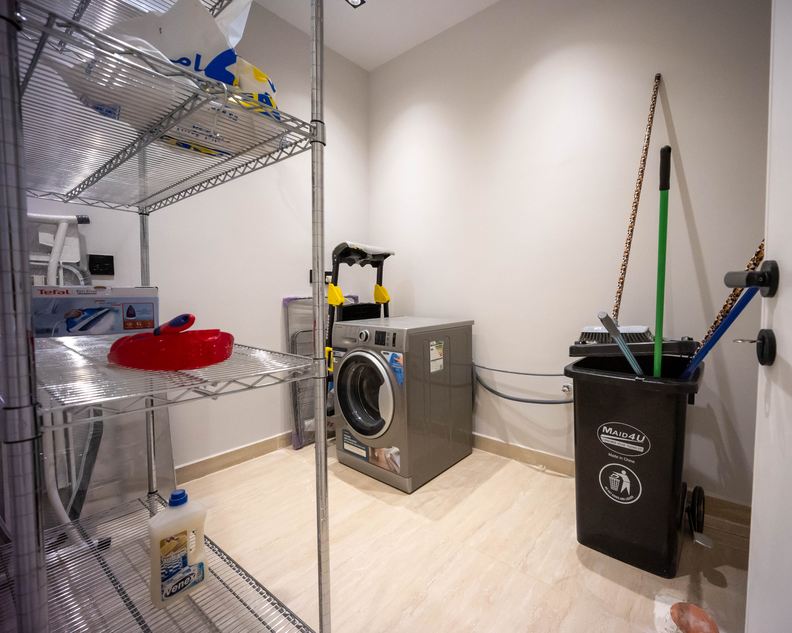 Fully equipped American-style kitchen: fridge, microwave, washing machine, full dishware set
