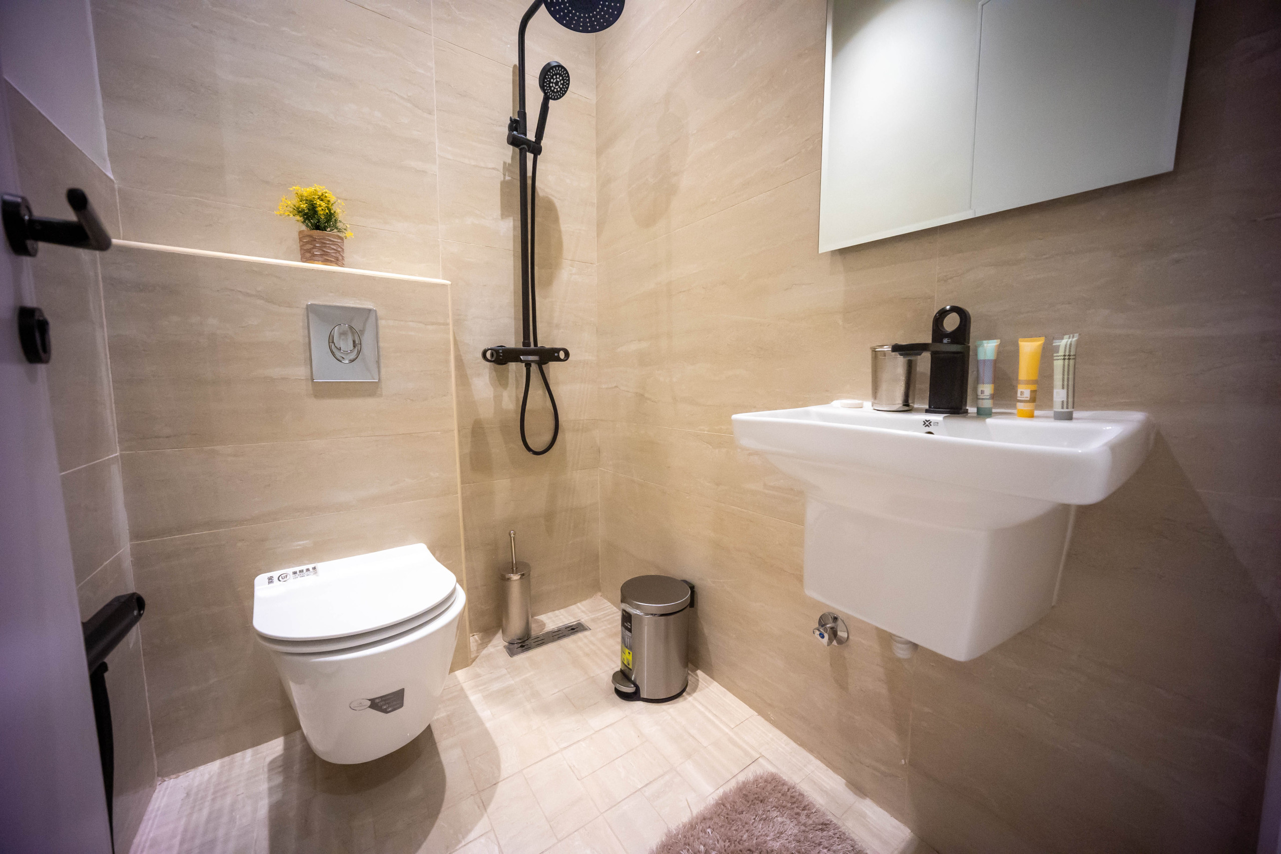 Spacious living area with air conditioning, smart TV, and high-speed WiFi