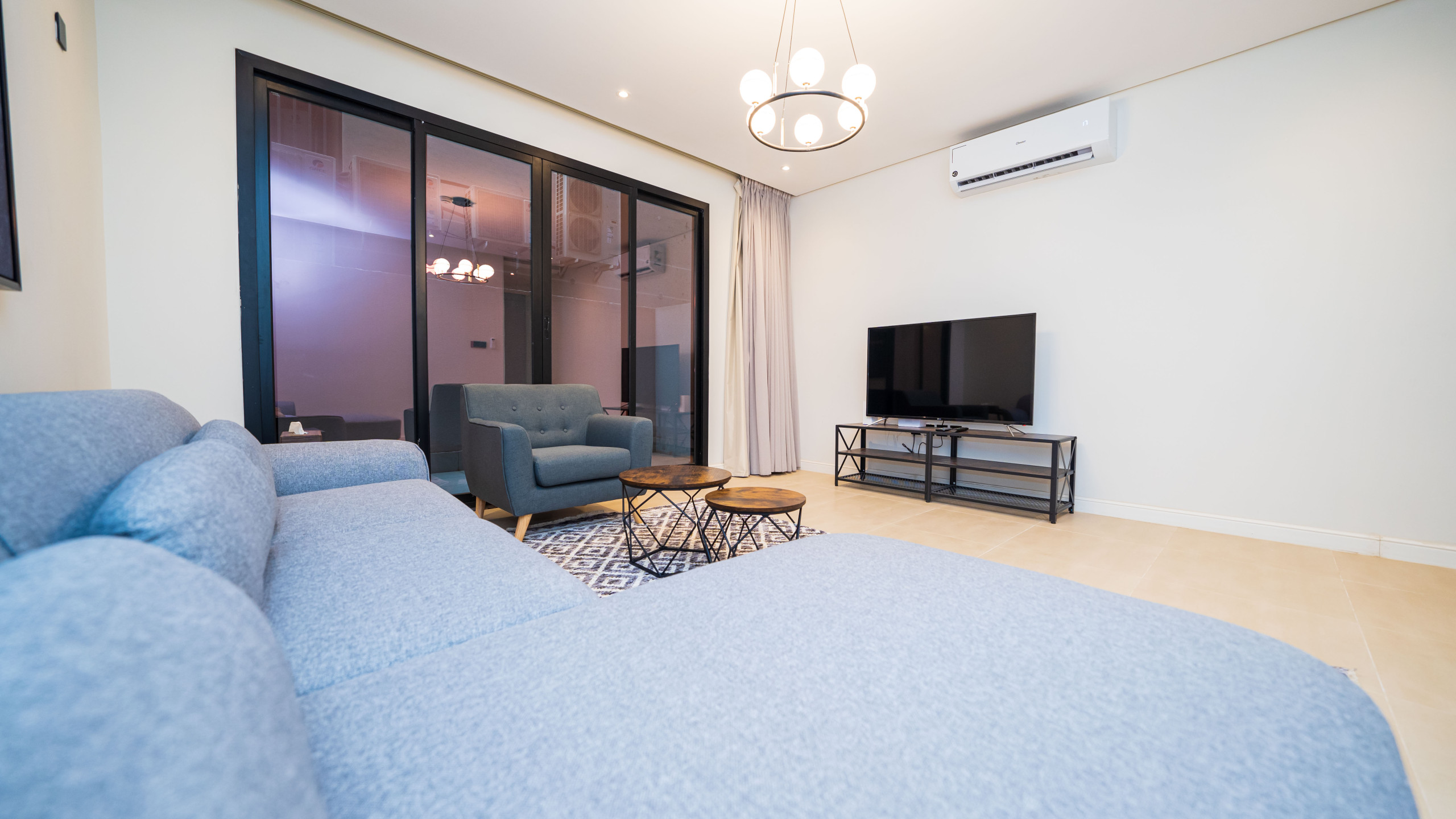 Spacious living area with air conditioning, smart TV, and high-speed WiFi