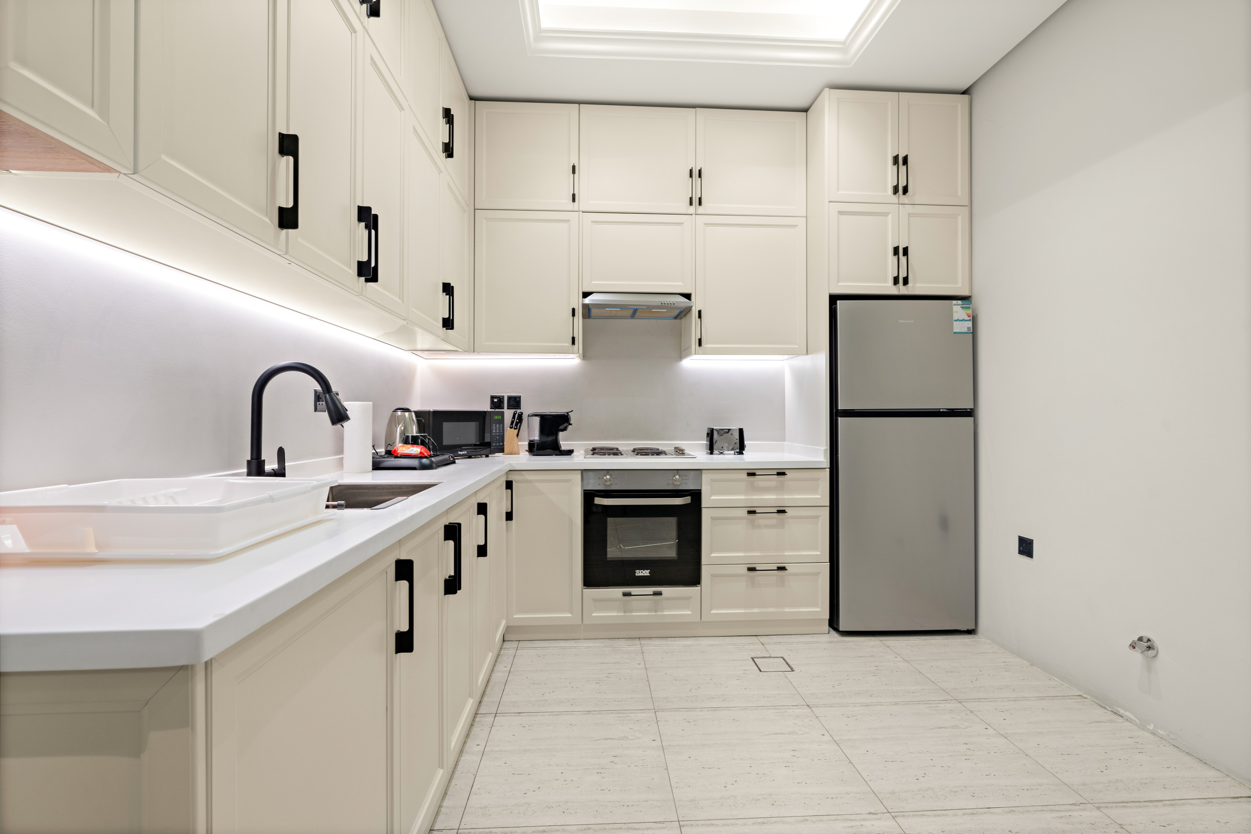Fully equipped American-style kitchen: fridge, microwave, washing machine, full dishware set