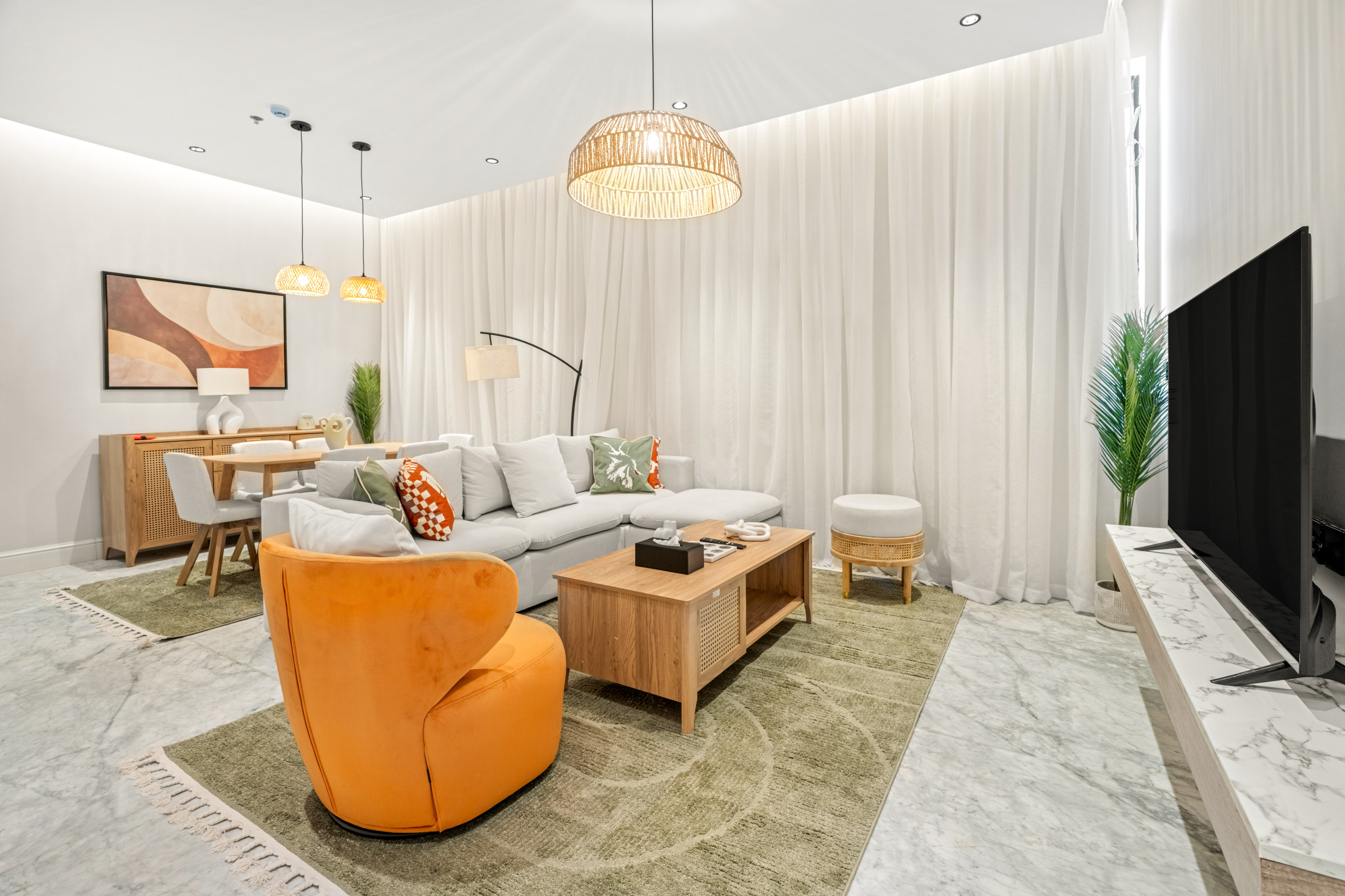 غرفة المعيشة: مساحة رحبة مع أريكة مريحة وتلفزيون ذكي.