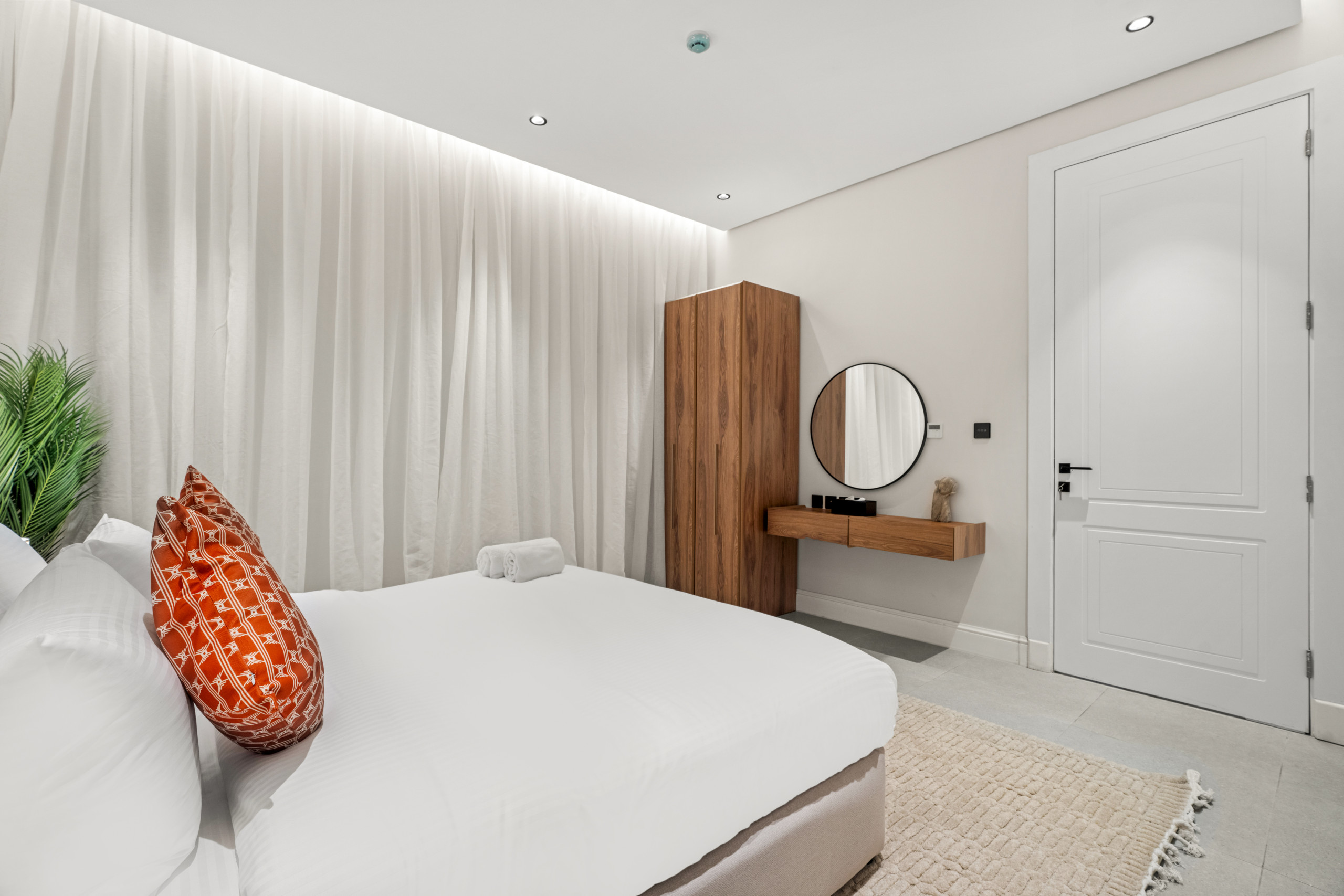 غرف النوم: غرفة بسرير ملكي وغرفتان بسرير مزدوج، مع خزائن ومكاتب.