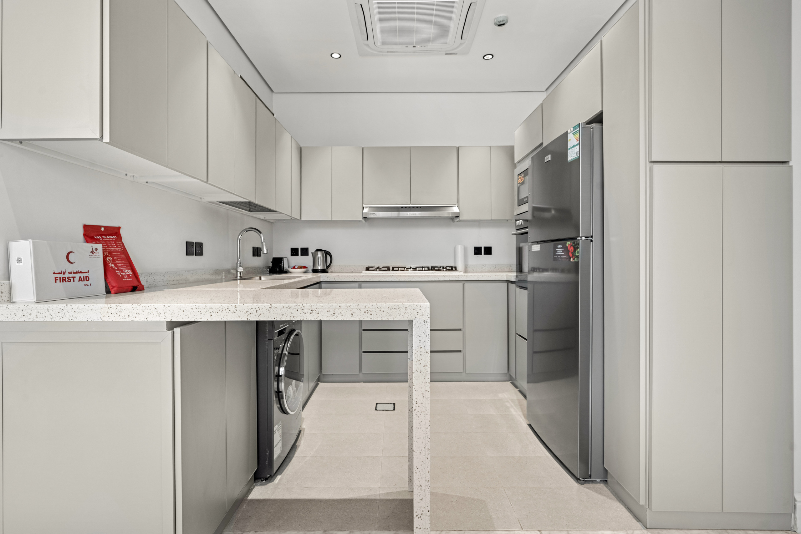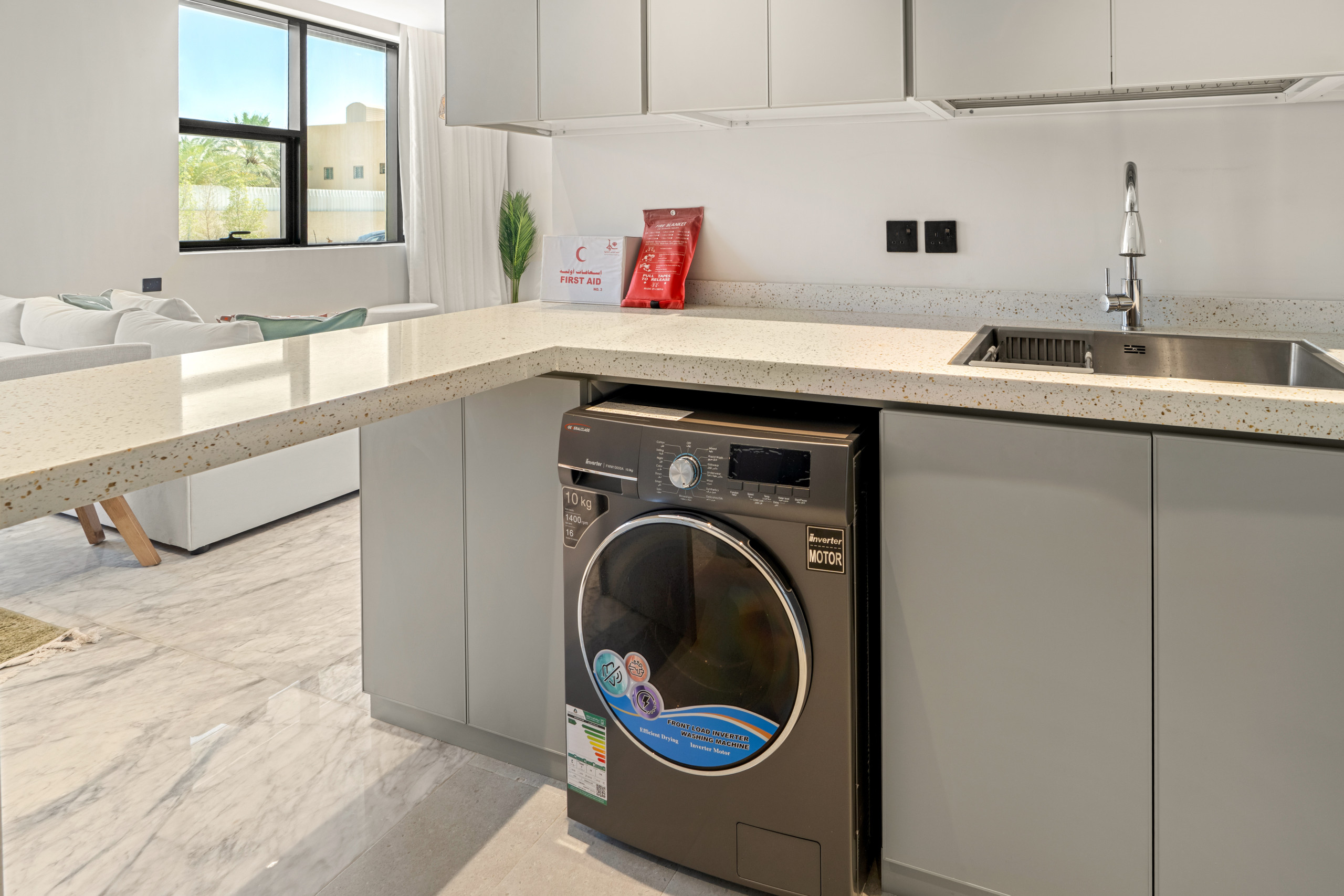 free WiFi and enjoy and TV for entertainment. The fully equipped American-style kitchen features a refrigerator, microwave, washing machine, and complete cookware, making home dining easy.