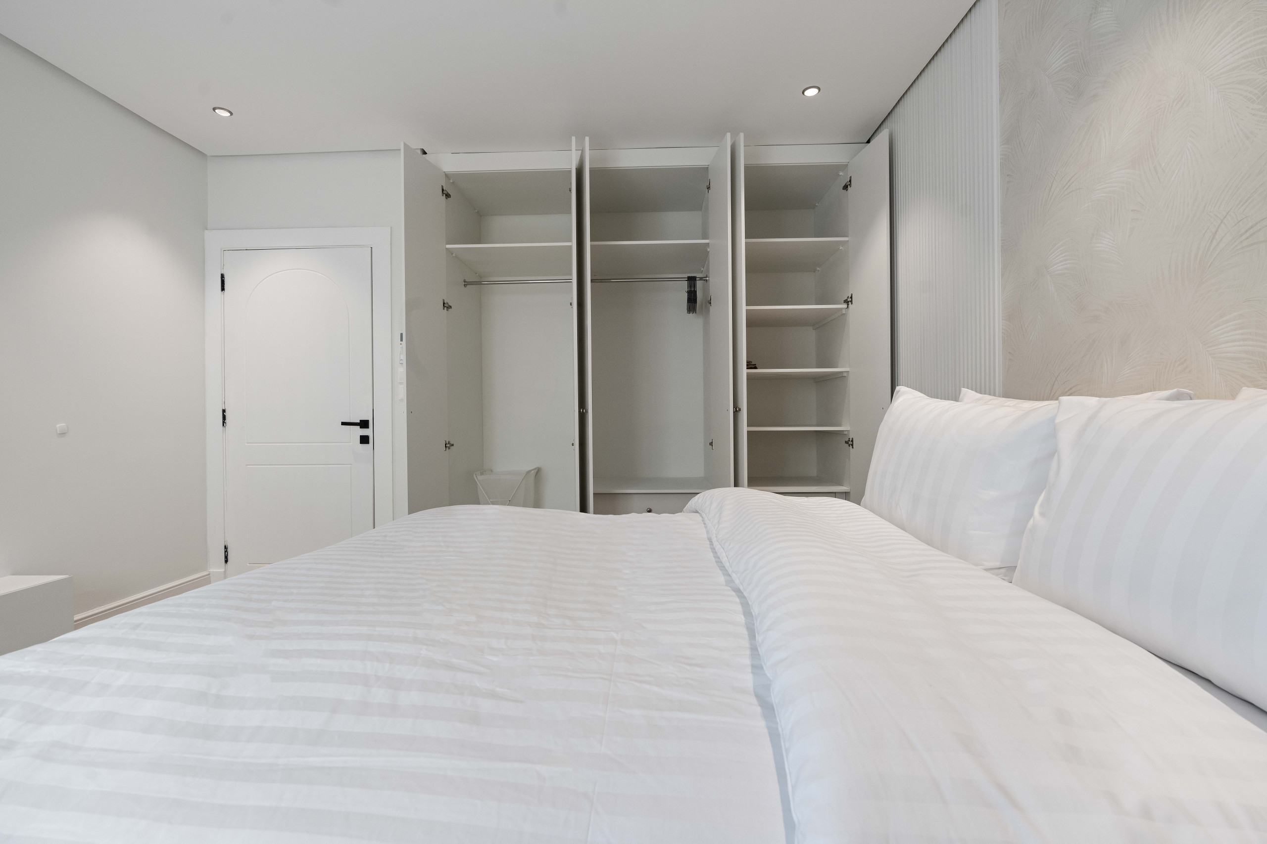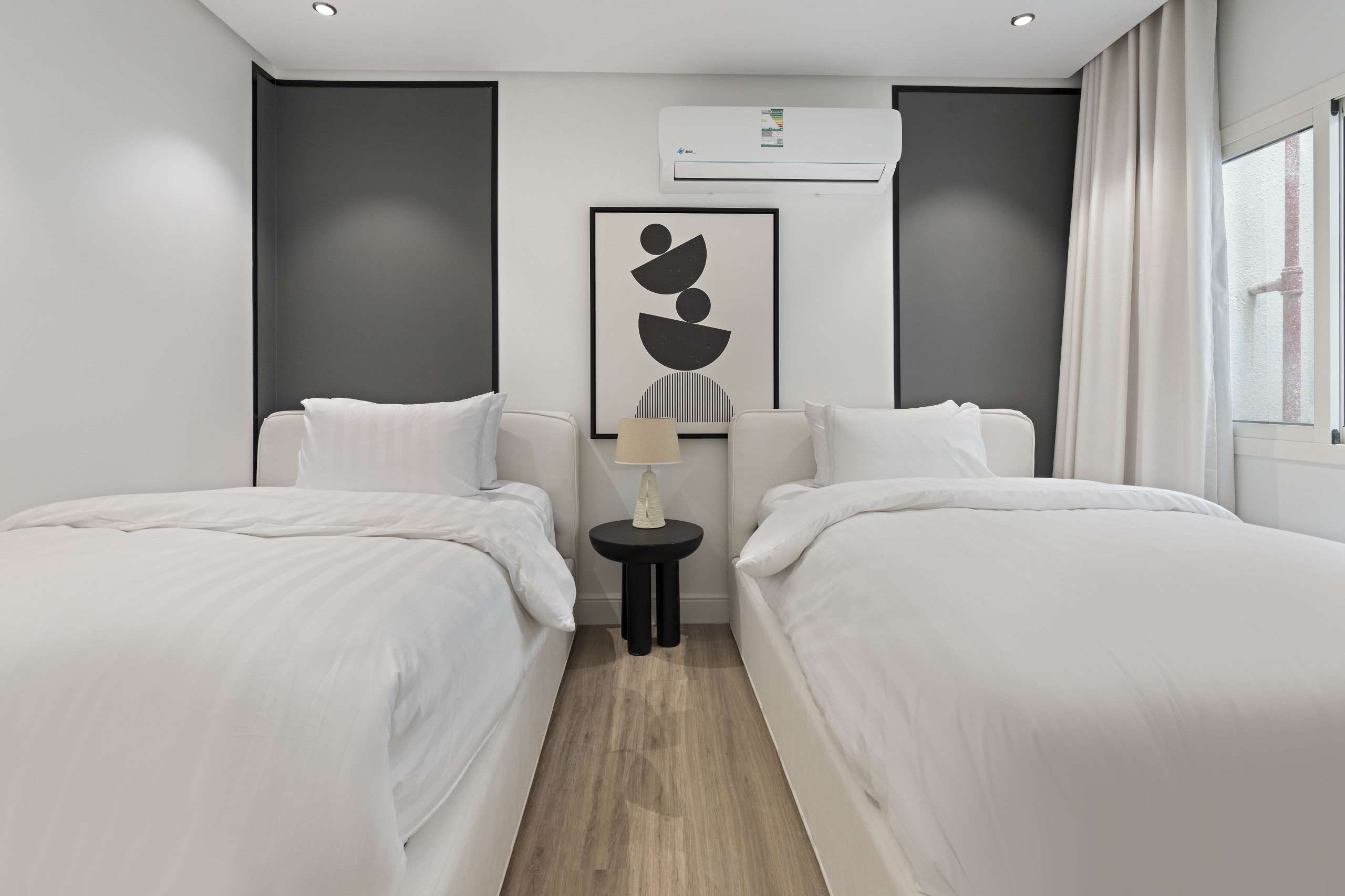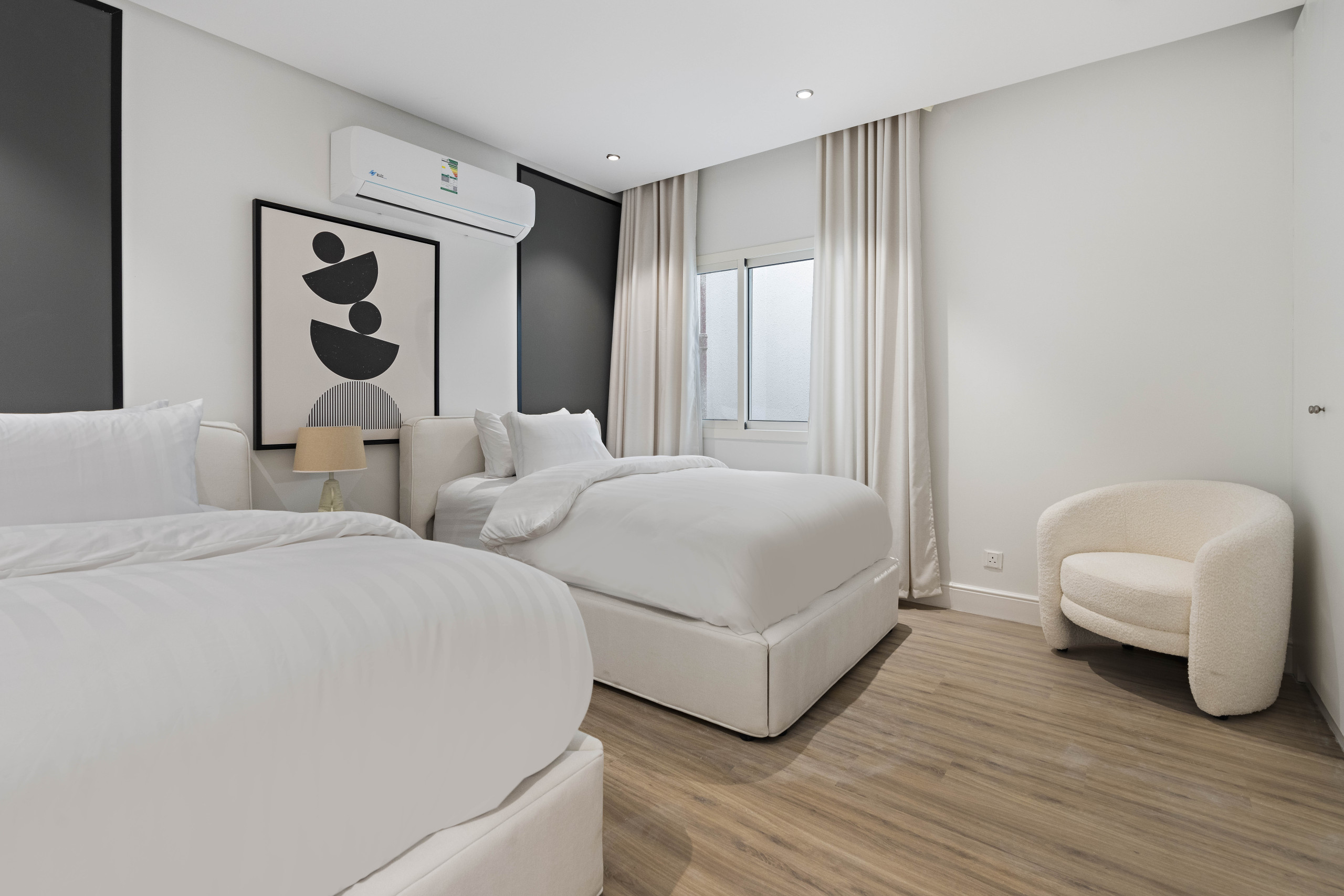 • Two spacious bedrooms, each with a king-sized bed and two twin beds, built-in wardrobes, and dedicated workspaces with desks and chairs.