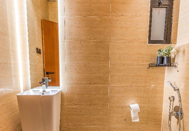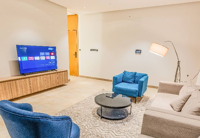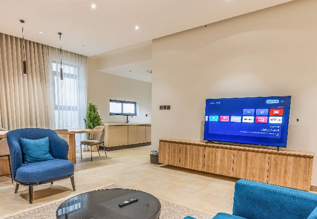 Luxury apartment in Riyadh, located in the An Narjis district, featuring 3 bedrooms with an elegant and tranquil design, a living area, a dining table, and a well-equipped kitchenette. Includes high-speed internet and self entry access.