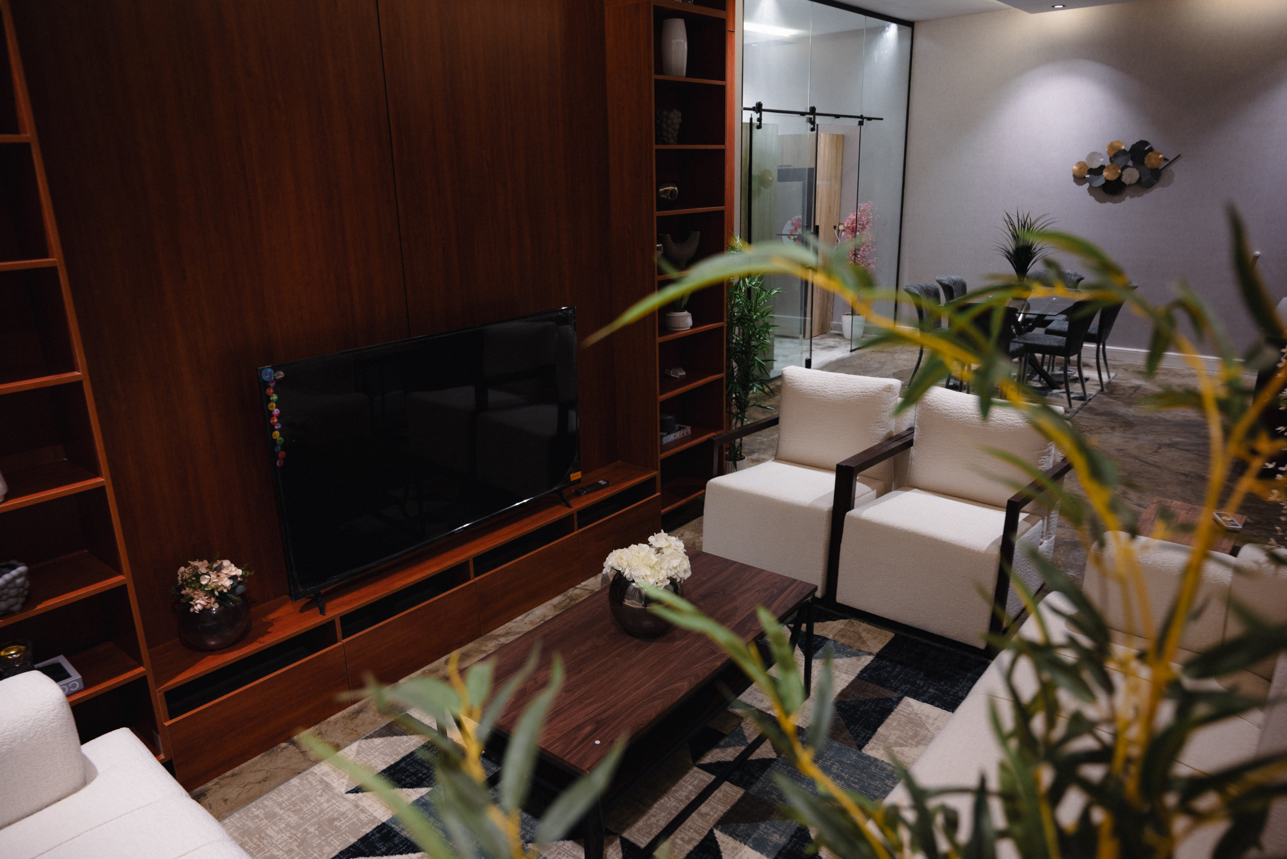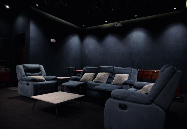 A stylish modern apartment featuring a cozy living room, elegant dining area, and fully equipped kitchen. It offers 3 bedrooms, 3 bathrooms, self check-in, private parking, and free high-speed Wi-Fi. The building includes a cinema and a play area for a unique family experience.