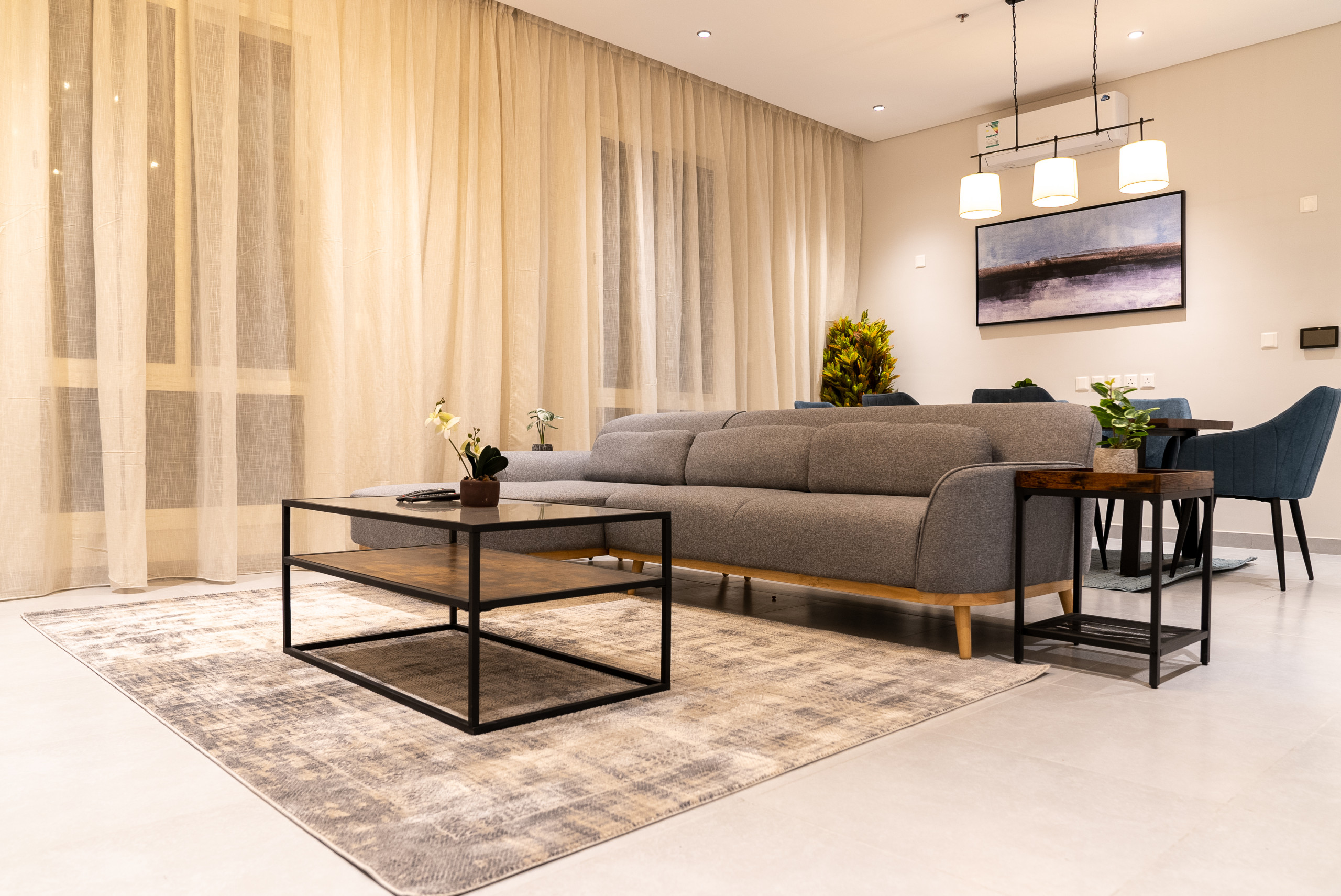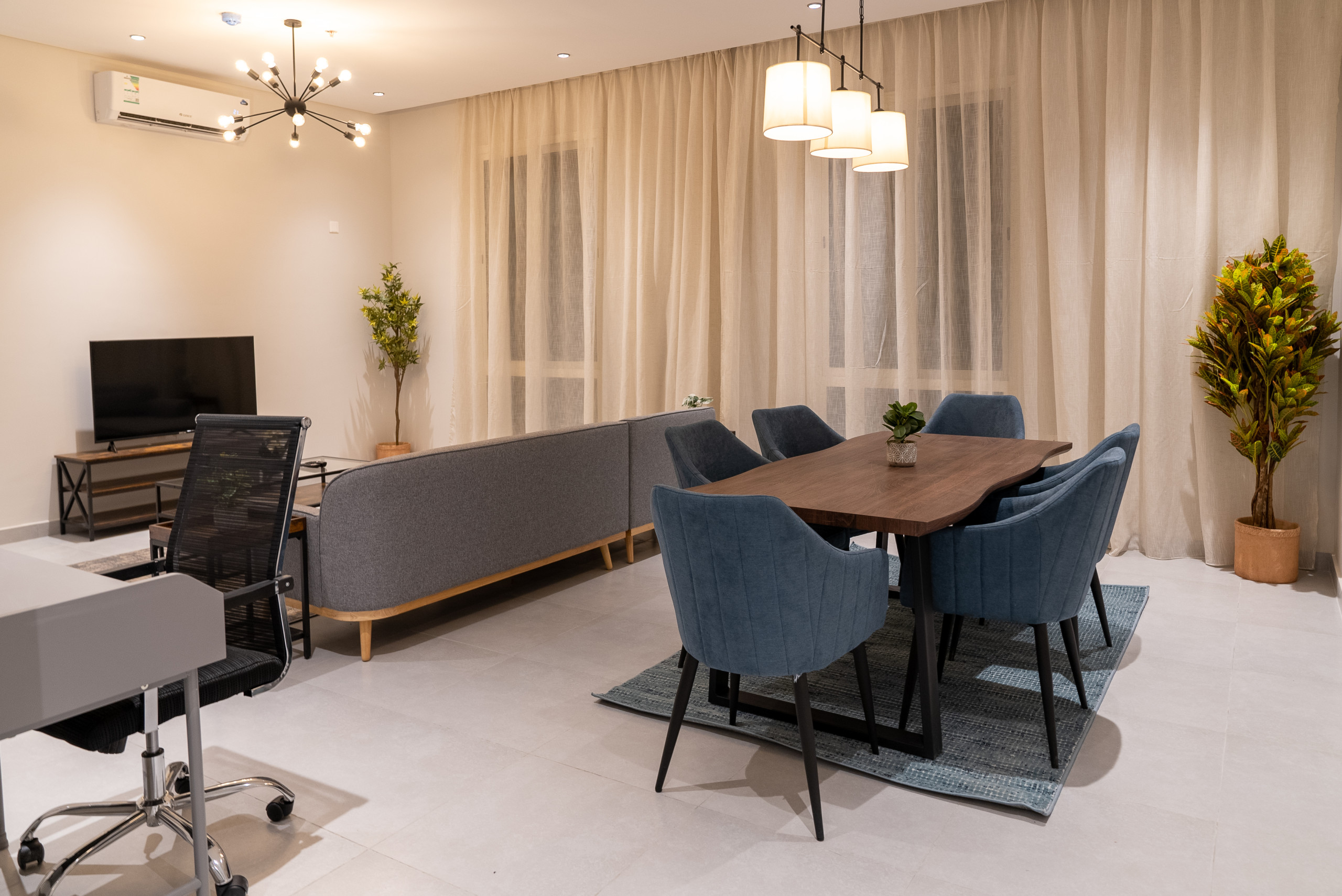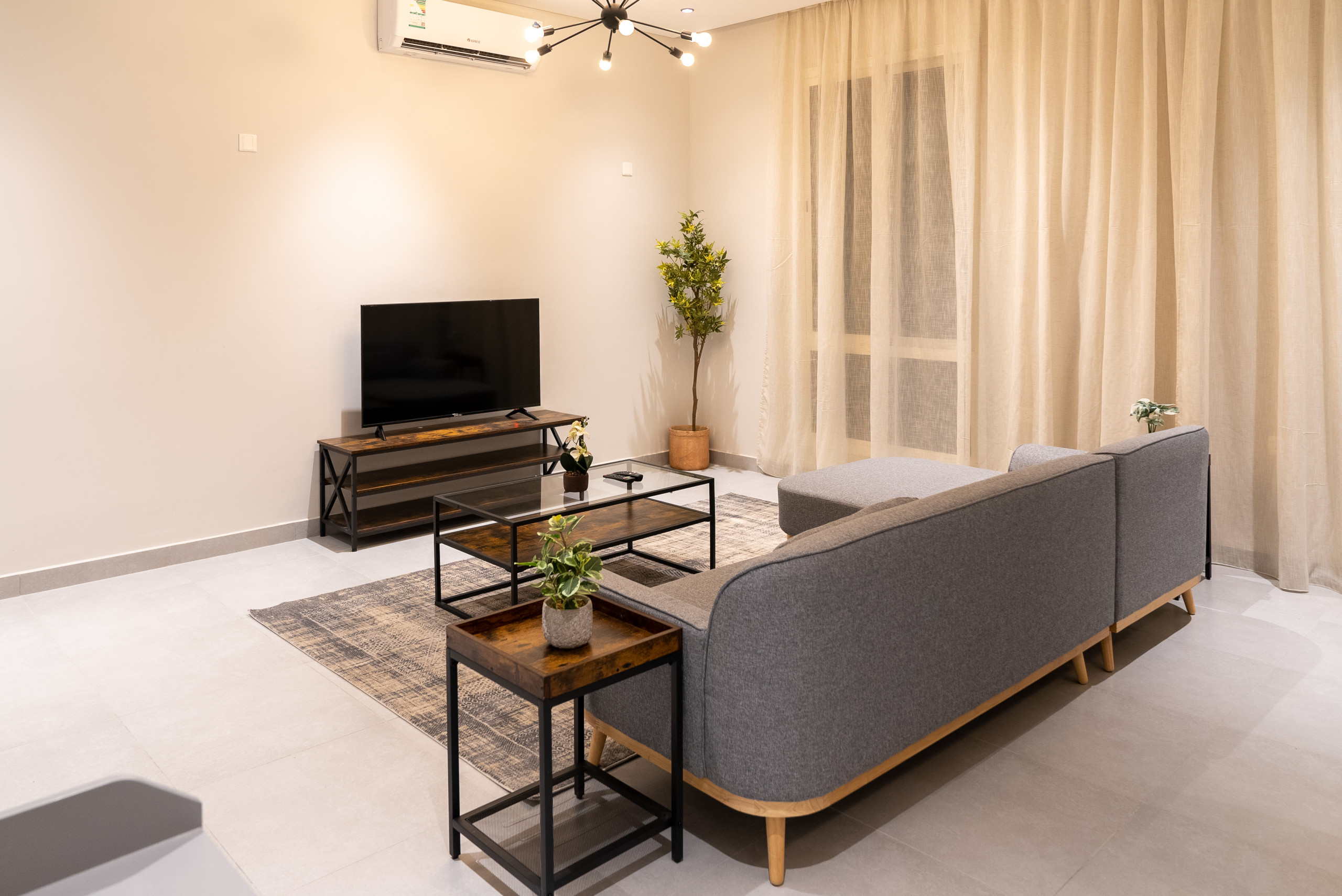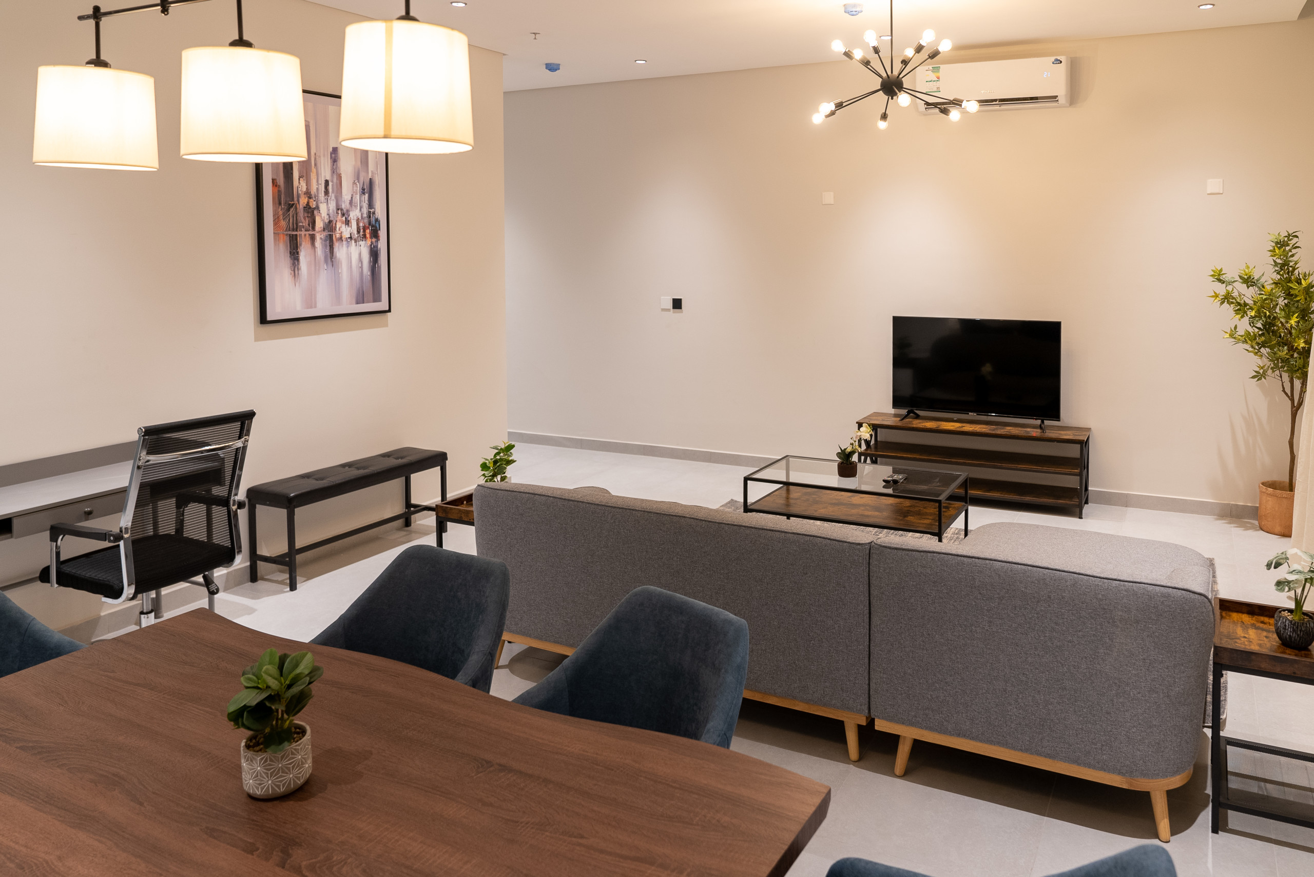Spacious living area with air conditioning, smart TV, and high-speed WiFi