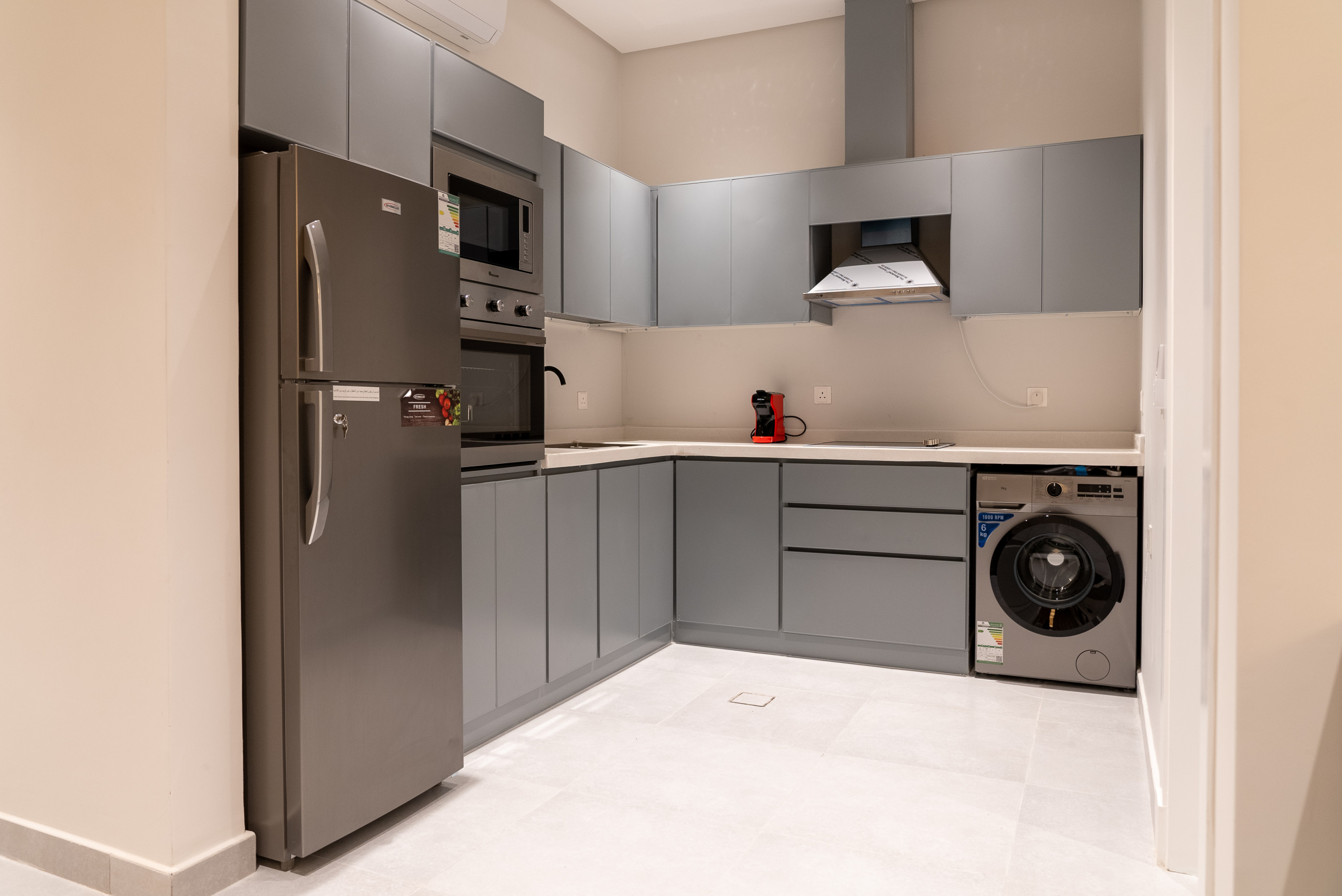 Fully equipped American-style kitchen: fridge, microwave, washing machine, full dishware set