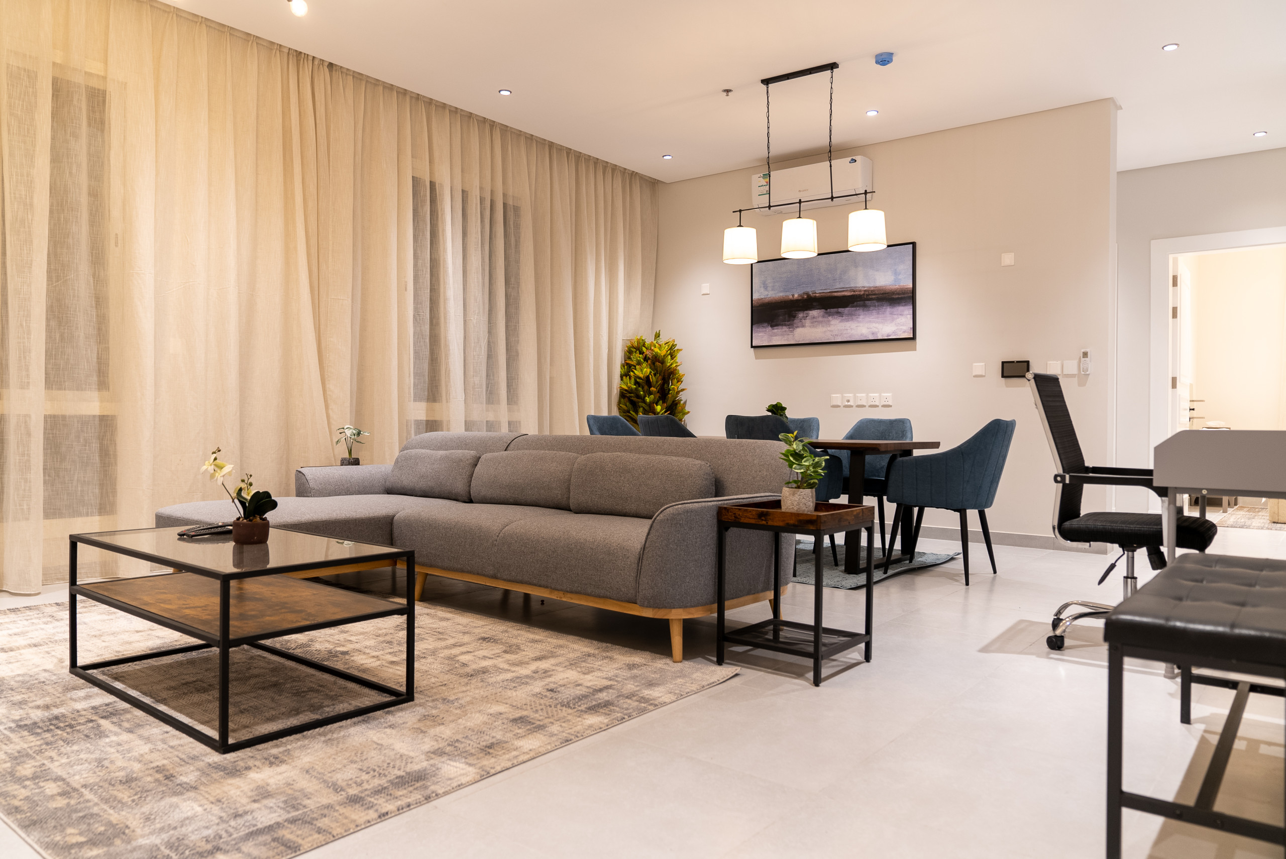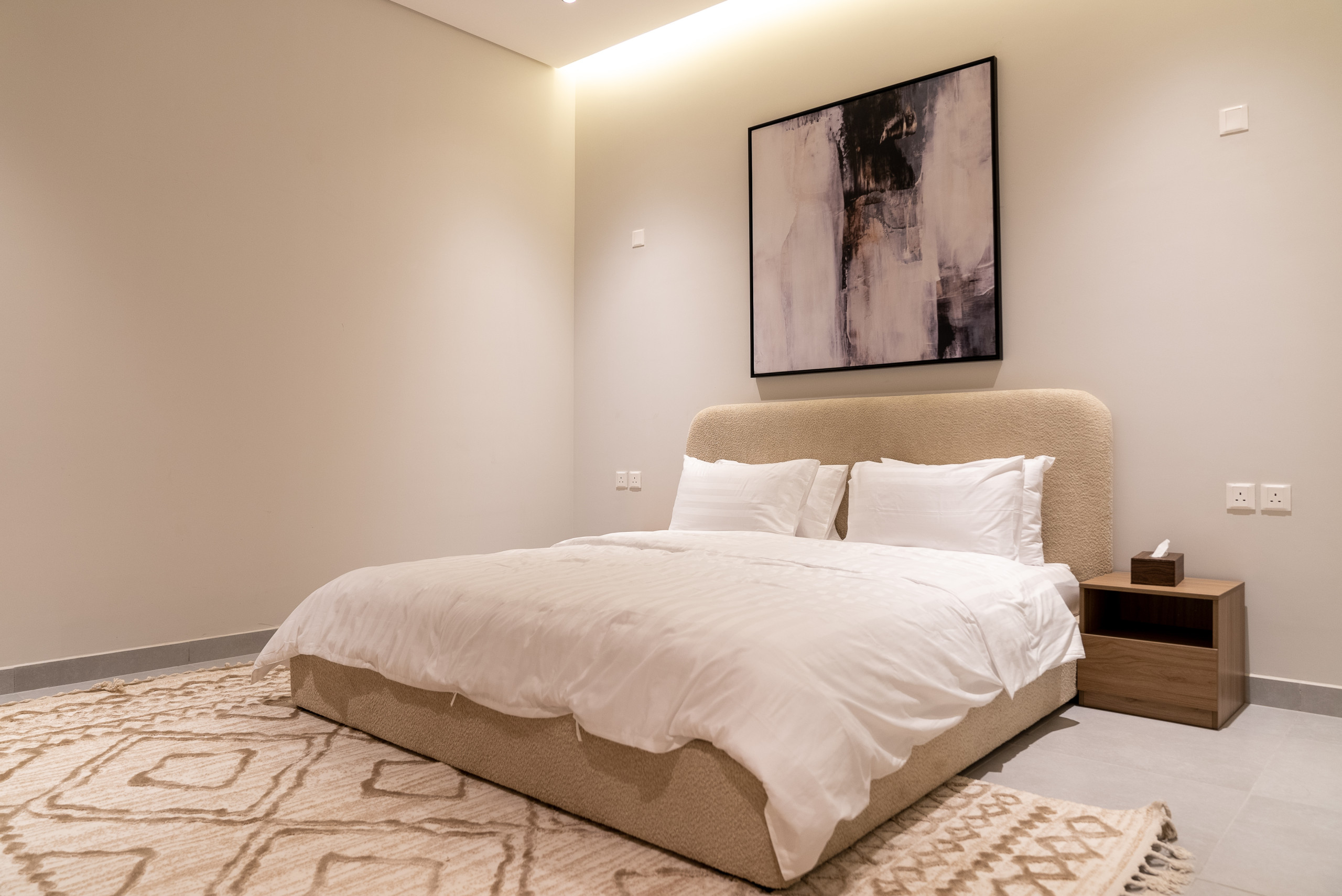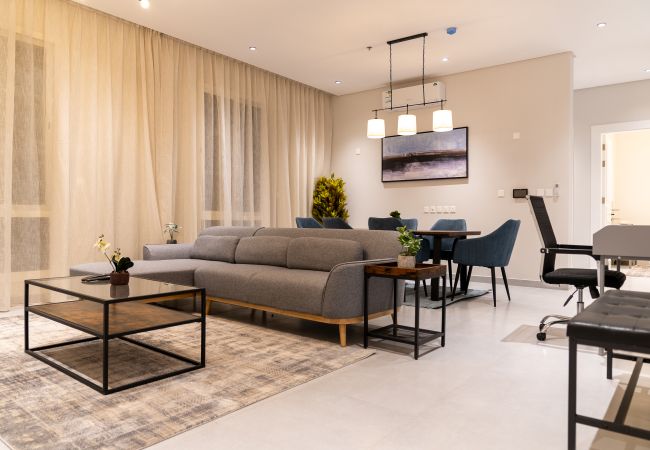 Stay in a modern, fully furnished apartment in Riyadh’s Al Malga district, Perfect for families, business travelers, or groups of friends, this 100 sqm serviced apartment combines comfort, convenience, and prime location.
