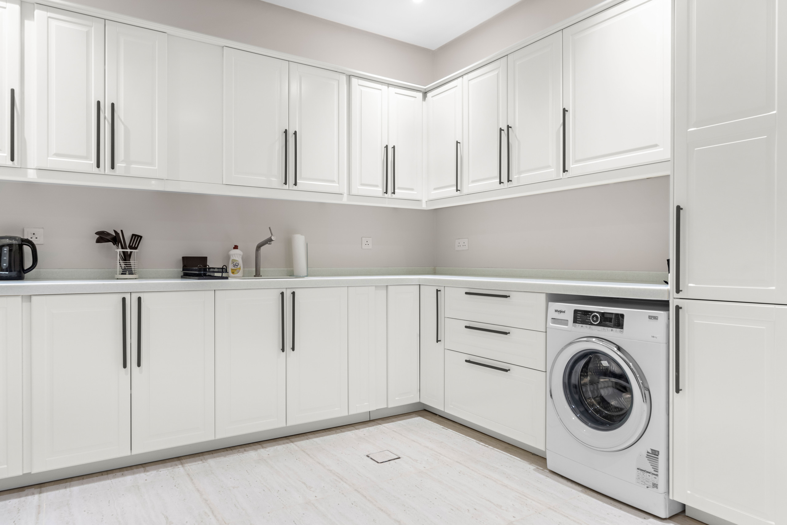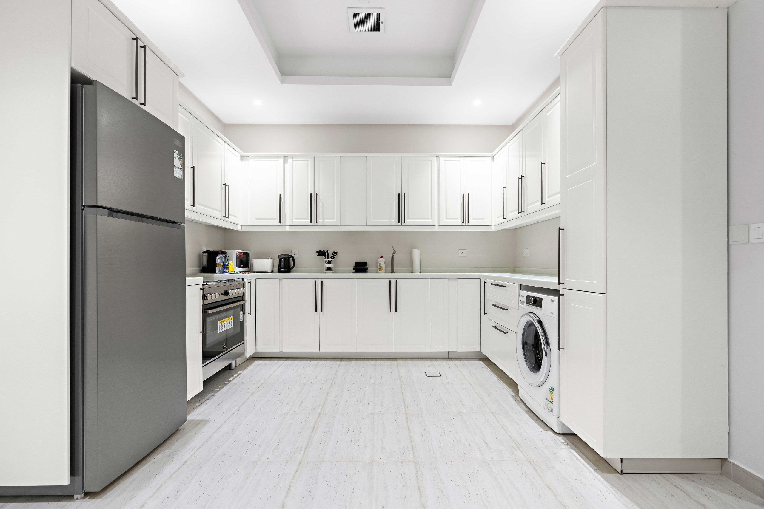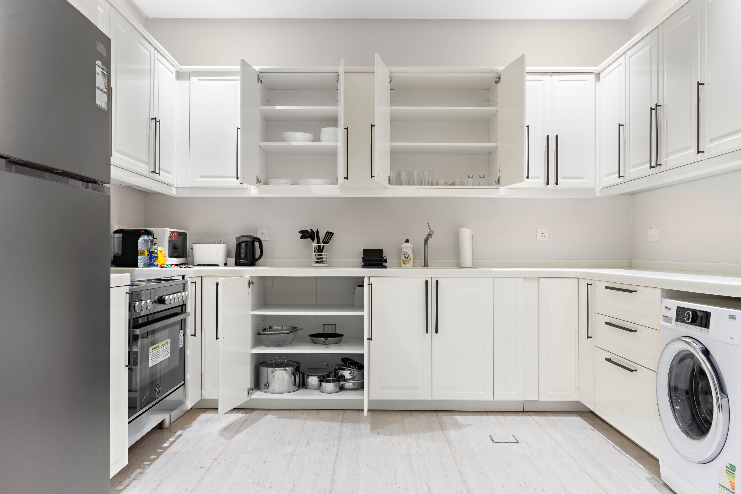 free WiFi and enjoy and TV for entertainment. The fully equipped American-style kitchen features a refrigerator, microwave, washing machine, and complete cookware, making home dining easy.