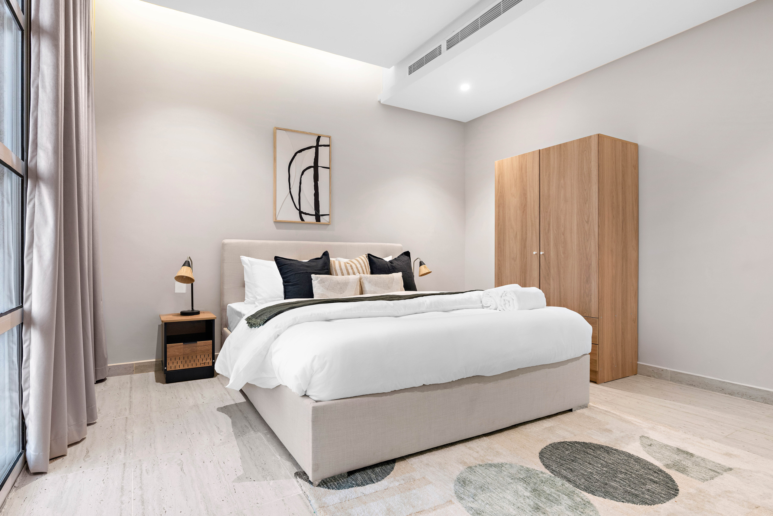 Discover a comfortable 2-bedroom apartment in Riad, perfect for up to 4 guests seeking a cosy urban retreat. This 102 square metre space offers a modern American-style kitchen fully equipped with essential appliances including a fridge, microwave, washing machine, and dishes.